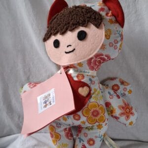 Deze Dorie is gemaakt van rood/roze stof met rode accenten en een rode tas.