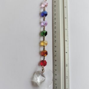 Kristallen hanger in hartvorm met kleine octagonkristallen in regenboog(chakra)kleuren.