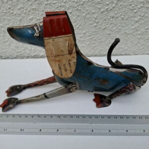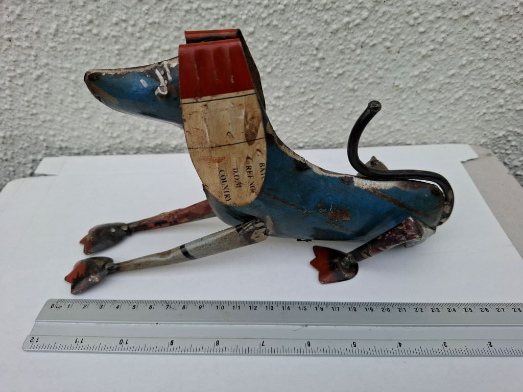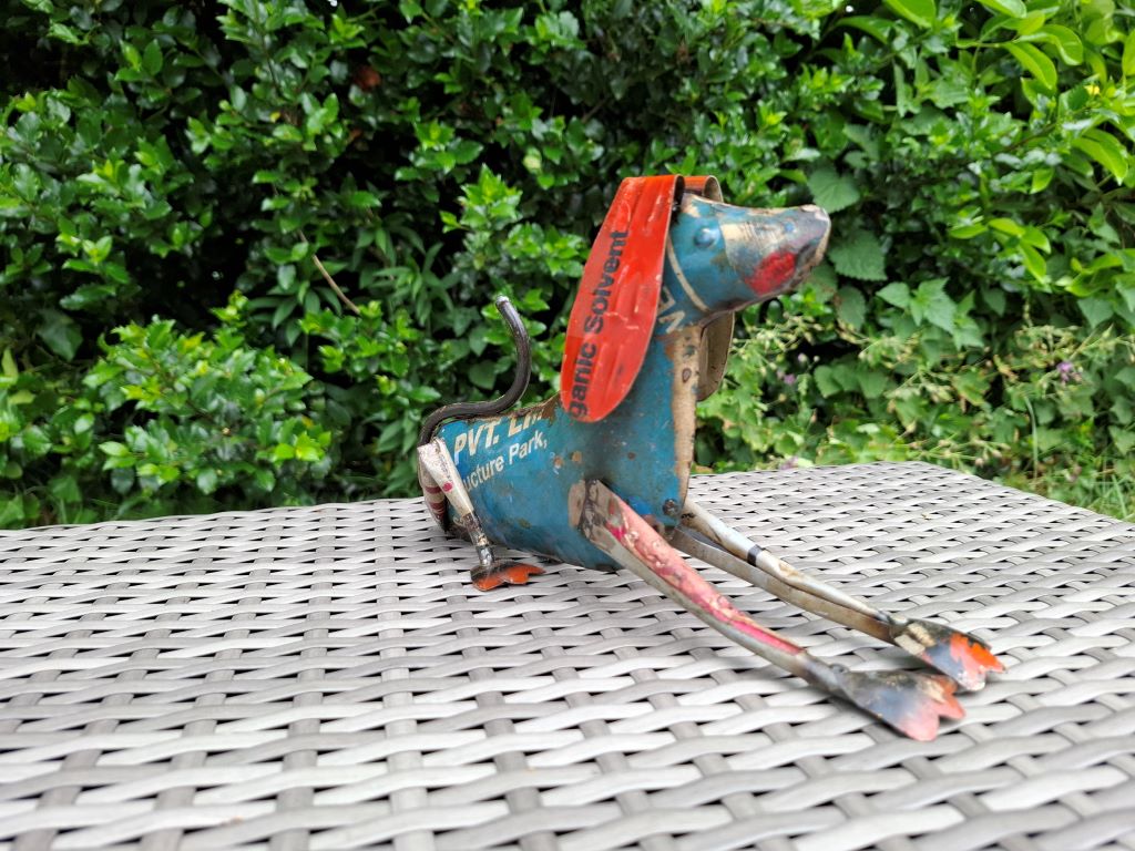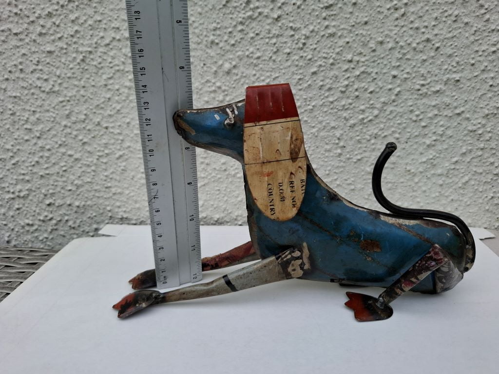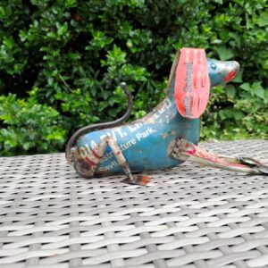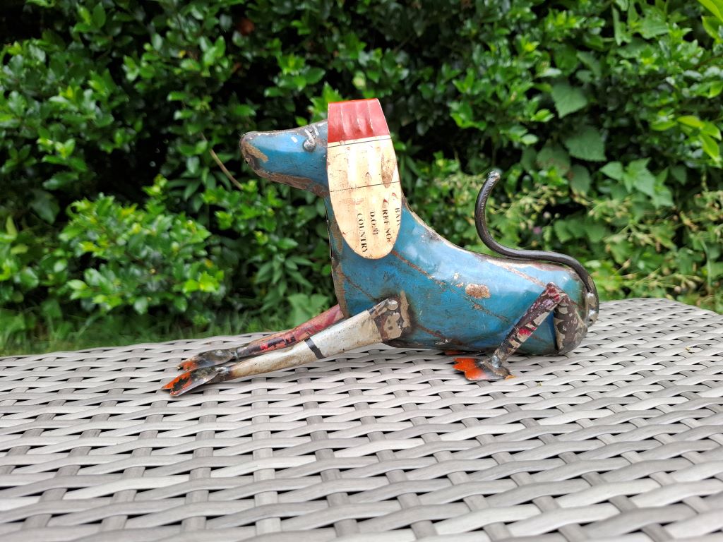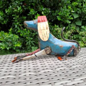 Leuke liggende hond, handgemaakt van gerecycled metaal.