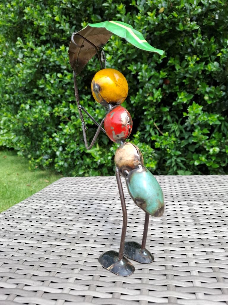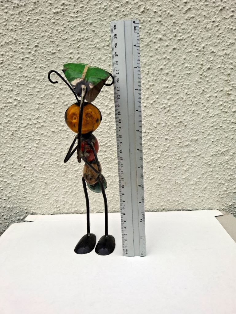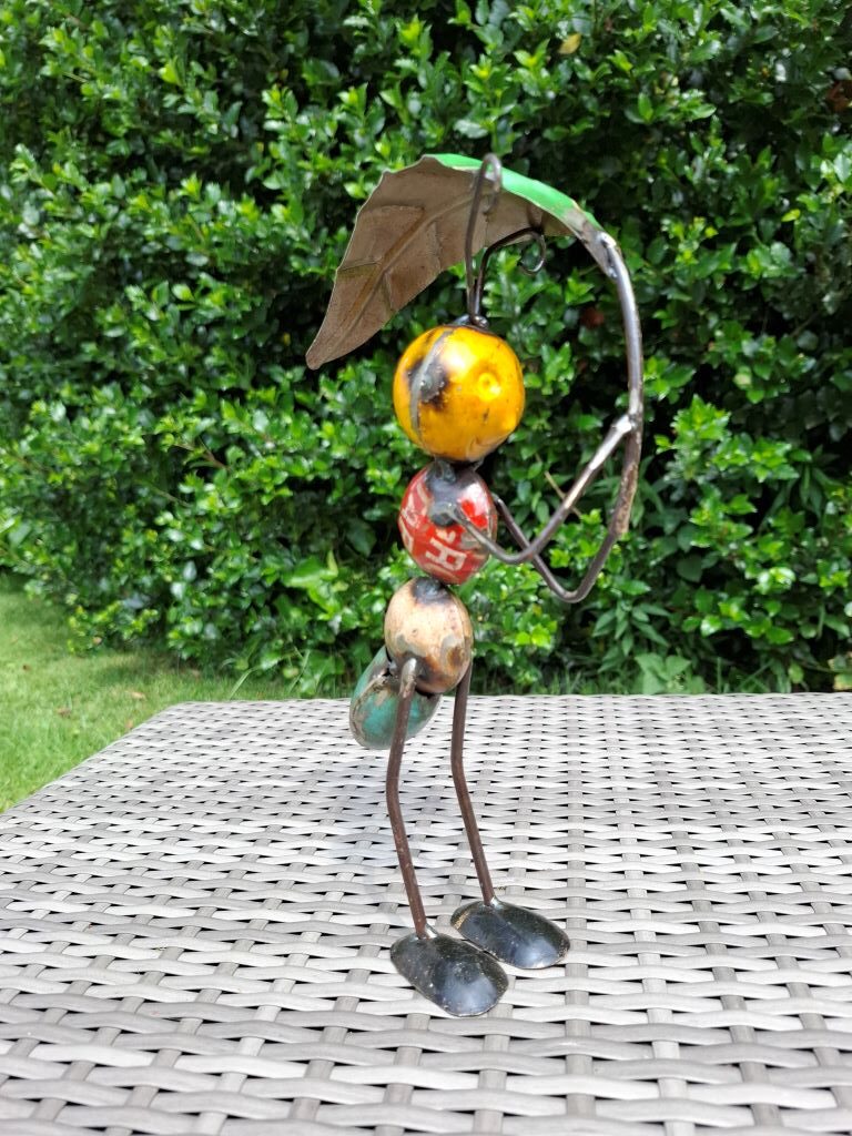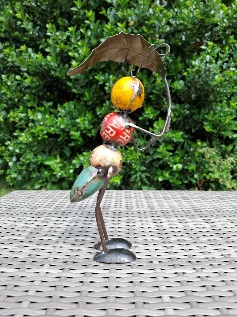 Grappige mier, handgemaakt van gerecycled metaal met een blad als paraplu (of parasol….).