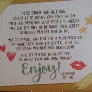 De mok heeft een afmeting van 12 cm lang, 9 cm breed en 8,5 cm hoog en is gemaakt van porselein.