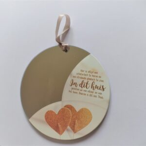 Aan de bovenzijde van de spiegel is een lintje bevestigd waardoor de spiegel overal is op te hangen.
