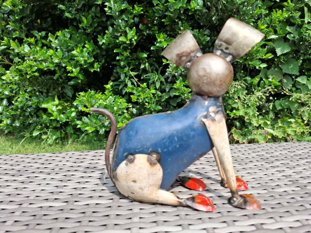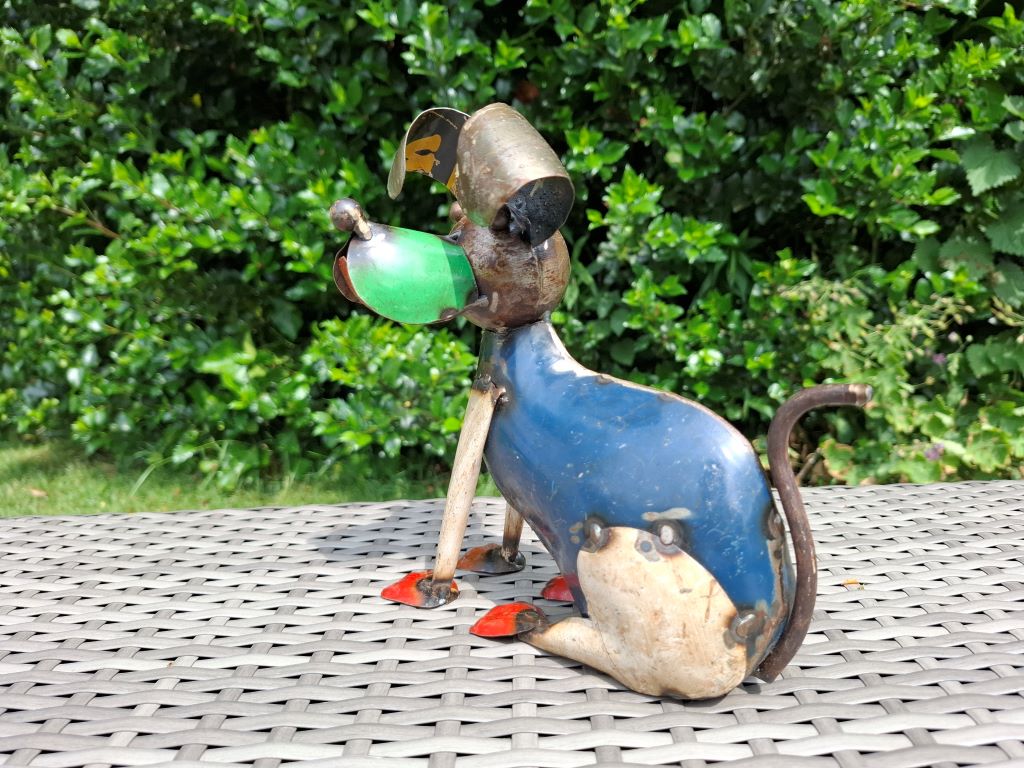 Leuke zittende hond, handgemaakt van gerecycled metaal.